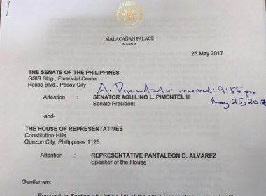 Ni Meanne Corvera Eagle News Naisumite na sa Senado at Kamara nitong Huwebes ng gabi ang report ni Pangulong Rodrigo Duterte hinggil sa mga batayan sa pagdedeklara ng martial law sa Mindanao. Ayon kay Senate President Aquilino Pimentel, personal niyang natanggap ang kopya ng report noong 9:55 p.m. sa Davao city. Pinirmahan niya raw ang report kasama si House Speaker Pantaleon Alvarez. Ang report ay natanggap ng Senado at Kamara limang minuto bago ang alas […]