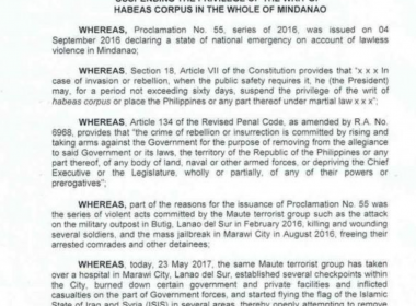 (Eagle News) — Malacañang sent President Rodrigo Duterte’s official declaration of martial law in Mindanao to Congress on Wednesday night for review and approval. The office of House Speaker Pantaleon Alvarez received a certified copy of Proclamation No. 216 at 10:26 p.m. from the Malacanang Records Office, a full 24 hours since martial law was declared in Mindanao by Presidential Spokesperson Ernesto Abella in Moscow, Russia, where President Duterte was then in an official visit. Proclamation No. […]