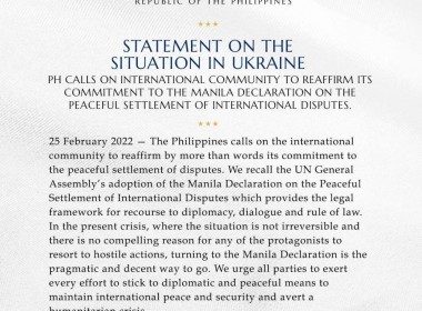 (Eagle News) – The Philippine government called on the international community to “reaffirm by more than words its commitment to the peaceful settlement of disputes” amid the increasing tensions between Russia and Ukraine. In a statement on the Ukraine situation issued by the Department of Foreign Affairs (DFA) on Friday, February 25, the DFA recalled the United Nations’ General Assembly’s adoption of the Manila Declaration of the Peaceful Settlement of International Disputes. The DFA […]