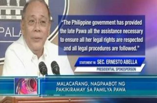 (Eagle News) – Agad naman nagpaabot na ng pakikiramay ang Malacañang sa mga naulilang pamilya ni Jakatia Pawa makaraang mabitay ito sa Kuwait, kahapon Enero 25. Sa statement na inilabas ni Presidential Spokesperson Ernesto Abella, ikinalulungkot ng Palasyo ang balita matapos na kumpirmahin ng Department of Foreign Affairs (DFA) na natuloy ang pagbitay kay Pawa. https://youtu.be/myHhirw4nSY