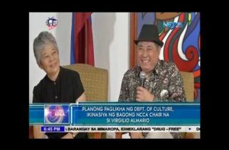 (Eagle News) — Pormal nang naupo bilang bagong Chairman ng National Commission for Culture and the Arts na si Virgilio Almario. Magandang balita naman ang ipina-abot sa kaniya gaya ng planong pagkakaroon ng Department of Culture na ngayon ay dinirinig na ng Senado. https://youtu.be/Bl5yJ5GRlas