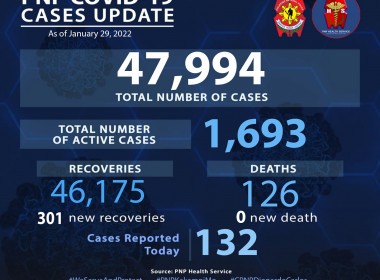 (Eagle News) — COVID-19 cases among police personnel rose to 47,994. According to the Philippine National Police, this was after 132 more cases were reported. Of the total cases, 1693 were active. Over 300–or 301–more COVID-19 recoveries were reported among police personnel, resulting in an increase in PNP COVID19 recoveries to 46175. No additional deaths were reported. The PNP COVID-19 death toll, therefore, remains at 126. President Rodrigo Duterte has said uniformed personnel, including policemen, […]