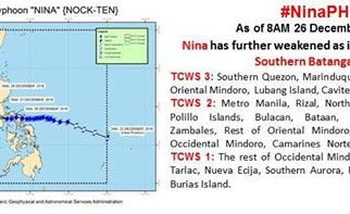 MANILA, Dec. 26 (PNA) — Typhoon “Nina” (international name Nock-ten) has weakened but stormy weather is expected to continue in the southern Tagalog and Bicol regions, state weather agency Philippine Atmospheric, Geophysical and Astronomical Services Administration (PAGASA) said Monday morning. In its 8 a.m. bulletin, PAGASA said the eye of “Nina” was last spotted 60 kilometers south of Tayabas, Quezon province. It has a maximum sustained winds of up to 140 kph near the […]