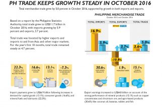 MANILA, Dec.12 –Total merchandise trade grew by 5 percent in October 2016, supported by growth in both imports and exports, according to the National Economic and Development Authority (NEDA). Based on a report by the Philippine Statistics Authority, total trade grew to US$11.7 billion in October 2016, with imports growing by 5.9 percent and exports, 3.7 percent. “Total trade was boosted by higher exports and imports to and from Asia and other major markets. For […]