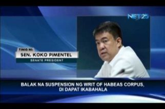 QUEZON City, Philippines – Senate President Aquilino “Koko Pimentel III appealed to the public to stop worrying about plans of suspending the writ of habeas corpus. Pimentel said that this was just an idea of the President that he voiced out publicly. Duterte was only “thinking out loud,” he said. Pimentel said the steps in the Constitution would still be strictly followed. https://youtu.be/GqW_I-pTqJ0