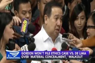 QUEZON CITY, Philippines (Eagle News) — Senator Richard Gordon said he will no longer file an ethics complaint against Senator Leila De Lima. Gordon said this after talking to Senator Sonny Trillanes before the start of the plenary session. Sen. Trillanes did not say what he and Gordon talked about. However, he admits that disagreements really happen when senators are on opposing sides of the issue.