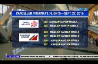MANILA, Philippines (Eagle News) — The Ninoy Aquino International Airport (NAIA) on Tuesday announced the cancellation of six international flights in Manila due to Typhoon Helen. The list of cancelled international flight as of Tuesday, Sept. 27, 2016 are the following: • China Airlines Flights 702 and 703 (Manila-Taipei-Manila) • Philippine Airlines Flights 428 and 427 (Manila-Narita-Manila) • Philippine Airlines Flights 896 and 897 (Manila-Kansai-Manila)