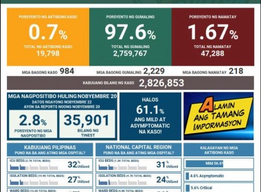 Total active cases just 0.8 percent of country’s total cases for 4th straight day (Eagle News) – The total number of active COVID-19 cases in the country has gone down to just 22.070 as more COVID-19 recoveries continue to be posted compared to those compared to new virus cases. The active cases just constitute 0.8 percent of total COVID-19 cases which as of Saturday, Nov. 20, stood at 2,824,499. This is the fourth straight day […]