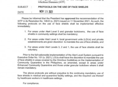 Use of face shield still mandatory in areas under Alert Level 5, granular lockdown areas (Eagle News) – The use of face shields in areas under COvid-19 alert levels 3, 2 and 1 “shall be voluntary,” according to a Nov. 15, 2021 memorandum from the Office of the President. In a memo issued by the Office of the Executive Secretary Salvador Medialdea on “protocols on the use of face shields,” it said that President Duterte […]