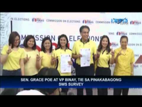In the latest survey conducted by the Social Weather Stations, Vice President Jejomar Binay and Senator Grace Poe took the top spot with each garnering 26%. Administration candidate Mar Roxas took the second spot with 22%, Davao City Mayor Rodrigo Duterte with 20% and Senator Miriam Defensor-Santiago taking the last place. (Eagle News Service Described by Jay Paul Carlos, Video Editing by Dexter Magno, Uploaded by MRFaith Bonalos)