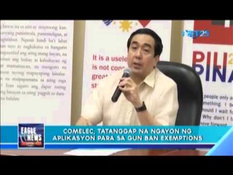 The Commission on Elections (COMELEC) will start accepting applications for gun ban exemptions for the 2016 elections. This is in order to issue the necessary permits in an earlier period. (Eagle News Service Described by Jay Paul Carlos, Video Editing by Jericho Morales, Uploaded by MRFaith Bonalos)