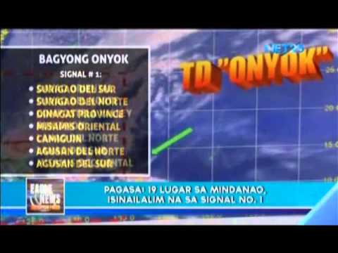 The Philippine Atmospheric Geophysical Astronomical Services Administration (PAGASA) placed 19 areas in Mindanao due to “Onyok”. The storm was spotted near Surigao. To find out the areas under storm signal number 1, please see the accompanying video. <em>(Eagle News Service Described by Jay Paul Carlos, Video Editing by Jericho Morales, Uploaded by MRFaith Bonalos)</em>