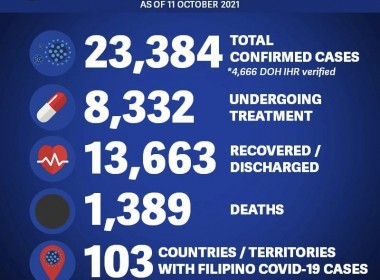 (Eagle News) — Sixty-seven more COVID-19 cases have been reported among overseas Filipinos. The Department of Foreign Affairs said the additional cases pushed the total COVID-19 cases to 23384. Meanwhile, 118 additional recoveries pushed the total recoveries among Filipinos abroad to 13663. No additional deaths have been reported, which means the death toll remains at 1389. The Middle East and Africa are the regions with the most COVID-19 cases, deaths and recoveries among overseas Filipinos, […]