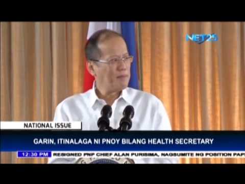 President Aquino officially appoints Janet Garin as Secretary of Health after several months serving in an acting capacity. Garin will replace resigned Health Secretary Enrique Ona.