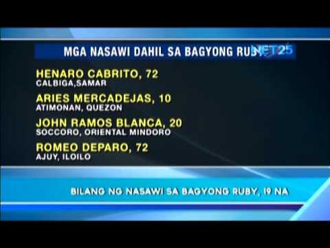 According to the National Disaster Risk Reduction and Management Council, the death toll due to typhoon “Ruby” now stands at nineteen, with more than 900 injured and 3 million displaced by the said typhoon.