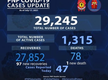 (Eagle News)–Forty-seven more COVID-19 cases were reported among police personnel. According to Philippine National Police data, the additional cases pushed the PNP COVID-19 total to 29245. Of these, 1315 were active. Ninety-seven more recoveries also pushed the PNP COVID-19 recovery total to 27852. An additional death was also reported, pushing the PNP COVID-19 death toll to 78. The inoculation of PNP personnel is ongoing. On Friday, July 16, the Department of Health said 16 additional […]
