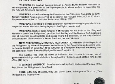 Pres. Duterte declares 10-day period of national mourning for ex-Pres. Aquino’s passing