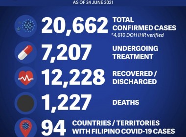 (Eagle News) — COVID-19 cases among overseas Filipinos are now at 20,662. According to recent Department of Foreign Affairs data, this was after one additional case was reported. “To date, the total number of countries and territories with confirmed cases among Filipinos abroad remains at 94,” the department said. Seven additional recoveries, meanwhile, pushed the COVID-19 recoveries among Filipinos abroad to 12,228. The COVID-19 deaths among overseas Filipinos remain at 1227, with no additional deaths […]
