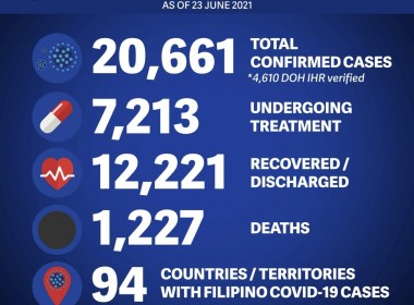 (Eagle News) — Over 200 more overseas Filipinos have tested positive for COVID-19. Recent Department of Foreign Affairs data showed the additional 226 COVID-19 cases pushed the COVID-19 total among Filipinos abroad to 20,661. “The reported spike is due to surge in COVID-19 cases reported in one country in the Middle East,” the DFA said. Meanwhile, 120 new recoveries and seven new fatalities also pushed the COVID-19 recoveries and deaths among overseas Filipinos to 12221 […]
