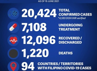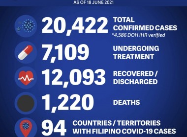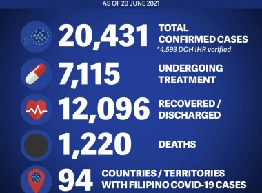 (Eagle News) — COVID-19 cases among overseas Filipinos are now at 20431. According to Department of Foreign Affairs data, this was after seven more COVID-19 cases were reported. No additional recoveries nor fatalities were reported among Filipinos abroad, which means the recovery total and death toll among Filipinos outside the country remain at 12096 and 1220, respectively. The Middle East and Africa are still the regions with the most COVID-19 cases, recoveries and deaths among […]