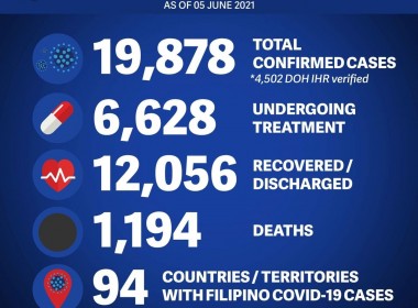 (Eagle News) — COVID-19 cases among overseas Filipinos are now at 19878 after two more cases were reported. According to recent Department to Foreign Affairs data, three additional recoveries also pushed the COVID-19 recoveries among Filipinos abroad to 12056. No additional death was reported, which means the COVID-19 death toll remains at 1194. “Compared to last week’s percentages, the total number of COVID-19 recoveries saw a slight decrease to 60.65%. Meanwhile fatalities and those under […]