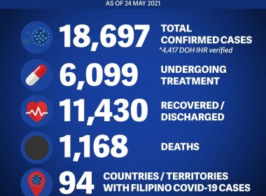 Percentage of total active cases at 4.1 percent, the lowest so far this year (Eagle News) – The Department of Health (DOH) announced the addition of 4,973 new COVID-19 cases in the country on Monday, May 24, bringing to 1,184,706 the total COVID cases in the country. The number of new cases was higher than Sunday’s 3,083 reported cases. But the total active cases in the country dropped to only 48,917 cases (from Sunday’s […]