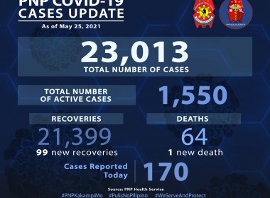 (Eagle News) — Over 100 more police personnel have tested positive for COVID-19. The Philippine National Police said the additional 170 cases pushed the PNP COVID-19 total to 23,013. Of these, the PNP said 1550 were active. Ninety-nine recoveries also pushed the PNP recovery total to 21399. The PNP COVID-19 death toll is also now at 64, including the additional one. The police are among the country’s frontliners amid the COVID-19 pandemic. Earlier, President Rodrigo […]