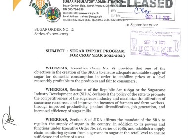 750K metric tons for industrial users, while another 750K MT for consumers; delivery set not later than November 15, 2022 (Eagle News) – The Sugar Regulatory Administration has authorized the importation of 150,000 metric tons of refined sugar – half of which are allocated to industrial users, while the other half is allocated to consumers. In SRA’s Sugar Order No. 2 signed by President Ferdinand Marcos Jr., and other agriculture and SRA officials, the […]