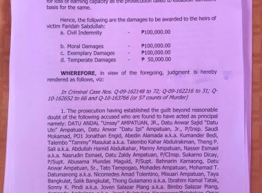 (Eagle News) — In this series of photos of the pages containing the dispositive portion of the 761-page decision on the Maguindanao massacre case, the names of those convicted for the gruesome mass murders of the 58 people, including 32 journalists, are listed. The decision by Quezon City Regional Trial Court branch 221 Judge Jocelyn Solis-Reyes read on Thursday, Dec. 19, 2019 showed the names of the 29 accused led by Datu Andal “Unsay” Ampatuan […]