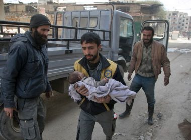 In photo: A man cradling a baby try to find a safe place amid air strikes in Syria