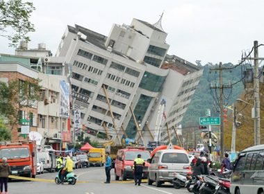 News in photos: Support girders prop up a building left tilting after 6.4 magnitude Taiwan quake