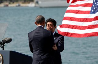 Japanese Prime Minister Shinzo Abe and U.S. President Barack Obama shake hands after speaking at Joint Base Pearl Harbor-Hickam, Hawaii, U.S.