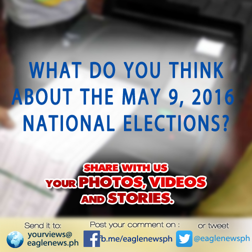 What do you think about the May 9, 2016 national elections? Share with us your photos, videos and stories. You may send it to: [email protected] or post your comment on fb.me/eaglenewsph and you may also tweet it on: @eaglenewsph
