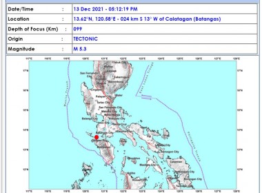 (Eagle News) – A magnitude 5.3 quake struck Batangas at 5:12 p.m. Monday, December 13, which was also felt in surrounding areas, the Philippine Institute of Volcanology and Seismology (PHIVOLCS) said. In a quake bulletin, PHIVOLCS said that the quake was of tectonic origin and was 99 kilometers deep. The epicenter was located 24 kilometers southwest of Calatagan, Batangas. The quake was felt at intensity 3 in Quezon City, and at intensity 2 […]