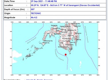 (Eagle News) – A magnitude 4.2 quake struck 63 kilometers west of Sarangani, Davao Occidental, just before midnight, at 11:48 p.m., Wednesday, Sept. 29. The quake only had a depth of focus of seven kilometers. It struck the waters off the coast of Sarangani town. It was felt at intensity 3 in KIamba, Sarangani; at intensity 2 in General Santos City and Maasin in Sarangani; and at intensity 1 in Tampakan, South Cotabato. Phivolcs […]