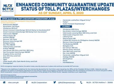 (Eagle News)–The Northern Luzon Expressway Corp. has released its list of toll plazas on NLEx and the Subic-Clark-Tarlac Expressway amid the enhanced community quarantine. NLEx Corp. said the list was as of Monday, April 6: NLEx said the list would be updated if there are changes. The enhanced community quarantine, which is expected to end mid-April, was aimed at containing the coronavirus disease 2019, which has killed over 100 people in the Philippines so far.