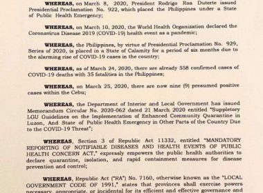(Eagle News)–Cebu province is now under an enhanced community quarantine. Governor Gwen Garcia made the declaration in Executive Order No. 5-N signed on Wednesday, March 25. In making the declaration, Garcia said there was “an urgent need to put the entire Province of Cebu under a state of enhanced community quarantine to allow the more stringent measures to be implemented.” For instance, starting March 27, at 12:01 a.m., the entry of all persons arriving from […]