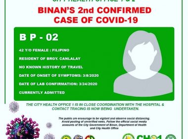 (Eagle News) — Biñan, Laguna on Tuesday, March 24, confirmed its second coronavirus disease 2019 case. In a Facebook post, Biñan’s public information office said the second case was a 42-year-old female resident of Barangay Canlalay. She had no known history of travel, and began experiencing symptoms on March 8. She was confirmed to have the virus on March 24. Biñan said the patient was currently admitted. The Philippines has over 500 confirmed COVID-19 cases […]