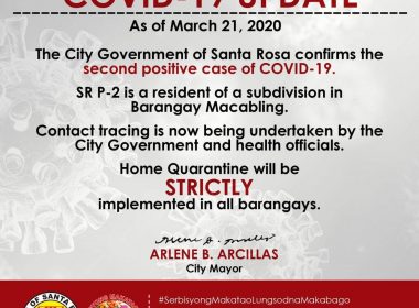 (Eagle News)–Santa Rosa, Laguna has confirmed its second coronavirus disease 2019 case. In a Facebook post, the Santa Rosa City government said that the second case was a resident of a subdivision in Barangay Macabling. “Contact tracing is now being undertaken by the city government and health officials,” the Santa Rosa government said. It said home quarantine shall be strictly implemented.