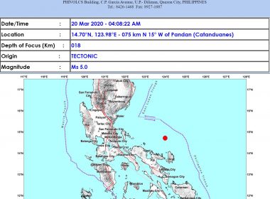 (Eagle News)— A magnitude 5 quake shook Catanduanes early Friday, March 20, with expected aftershocks, according to the Philippine Institute of Volcanology and Seismology (PHIVOLCS). The quake of tectonic origin had a depth of 18 kilometers and occurred 75 kilometers northwest of Pandan, Catanduanes at 4:08 a.m., Friday. It was felt at intensity 2 in Paracale, Camarines Norte, and in Bula, Camarines Sur. Instrumental intensities were recorded as follows: Intensity II – Iriga City […]