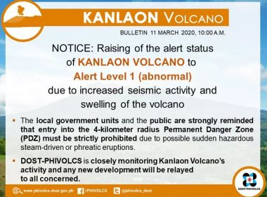 (Eagle News)–The Philippine Institute of Volcanology and Seismology has raised an alert level 1 over Mt. Kanlaon due to what it said was increased seismic activity and the swelling of the volcano. Alert level 1 means the volcano is in an abnormal state. In its advisory, PHIVOLCS said Kanlaon volcano’s seismic monitoring network recorded a total of 80 volcanic earthquakes since March 9. PHIVOLCS said this was dominated by 77 low-frequency events that are “associated […]