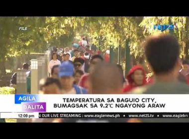 (Eagle News) — Bumagsak sa 9.2 degrees Celsius ang temperatura sa baguio city ngayong araw, Enero 30. Ayon sa Philippine Atmospheric Geophysical And Astronomical Services Administration-Baguio, alas 5:00 ng umaga naitala ang naturang temperatura na mas mababa pa kumpara sa 9.8 degrees Celsius na naitala dalawang araw ang nakararaan. Ito na ang pinakamababang temperatura sa Baguio City na naitala ngayong Enero 2019. https://youtu.be/jM3Ml8OfSs8