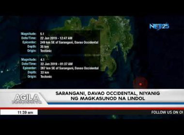 (Eagle News) — Two earthquakes jolted Sarangani, Davao Occidental early Tuesday, Jan. 22, the Philippine Institute of Volcanology and Seismology said. The first earthquake, a 5.1-magnitude one, struck at 12:47 a.m. Its epicenter, PHIVOLCS said, was located 249 kilometers southeast of Sarangani. A magnitude 4.1 quake hit the province an hour later, PHIVOLCS said. It said the epicenter of the second earthquake was located 267 kilometers southeast of Sarangani. PHIVOLCS said both earthquakes were tectonic […]