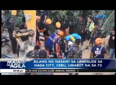 (Eagle News) — Umabot na sa pitumpu’t dalawa ang bilang ng nasawi sa nangyaring landslide sa Naga City, Cebu. Ayon sa Office of Civil Defense ng Region 7, animnapu’t lima na ang natukoy magmula nitong September 30. Labingwalo ang nasugatan habang sampu katao ang kasalukuyan pa ring nawawala. Sabi ni OCD Regional Director Concepcion Ornopia, lahat ng mga kinauukulang local government units ay nagpasya na aniya na ihinto na ang search operations sa lugar na […]
