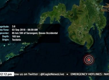 (Eagle News) — Niyanig ng magnitude 3.6 na lindol ang bayan ng Sarangani sa lalawigan ng Davao Occidental. Ayon sa Philippine Institute of Volcanology and Seismology (PHIVOLCS), naitala ang pagyanig sa 65 kilometers south ng Sarangani, kaninang umaga bandang 6:59. Ayon sa PHIVOLCS, may lalim na 165 kilometers at tectonic ang origin ng nangyaring pagyanig. Wala namang naitalang pinsala sa mga ari-arian, intensities at aftershocks. https://youtu.be/mvKFF3CDgig