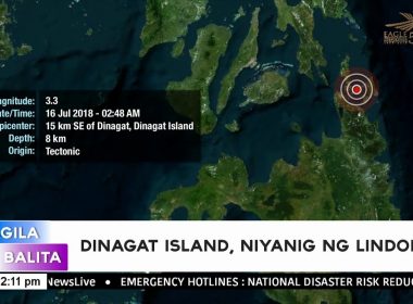(Eagle News) — Niyanig ng magnitude 3.3 na lindol ang munisipalidad ng Dinagat sa Dinagat Island kaninang madaling araw, Hulyo 16. Ayon sa Philippine Institute of Volcanology and Seismology (PHIVOLCS), naitala ang epicenter ng lindol sa layong 15 kilometro silangan ng munisipalidad. May lalim ang pagyanig na walong kilometro at tectonic ang dahilan. Hindi naman inaasahan ang pinsala sa mga ari-arian sa kasunod pang mga pagyanig. https://youtu.be/hydJ4KJt2CY