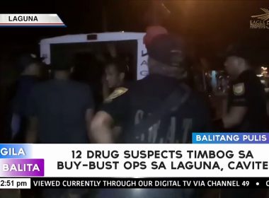 (Eagle News) — Arestado ang 12 drug suspek sa ikinasang magkakahiwalay na buy-bust operation sa Laguna at Cavite. Batay sa ulat ng Regional Police Office, target ng operasyon ang drug suspek na si Angela Borigas sa bahagi ng Barangay Canlalay sa Biñan, Laguna. Bukod kay Angela, huli rin sa akto ang 10 pang kasamahan nito sa isinagawang drug transaction ng isang pulis na nagsilbing poseur-buyer. Nakuha mula sa mga ito ang may dalawang gramo ng […]