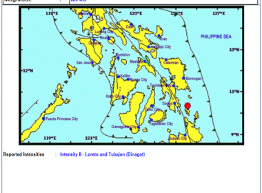 (Eagle News) — A 4.8-magnitude earthquake struck Dinagat on Thursday, the second one in a month’s time, the Philippine Institute of Volcanology and Seismology said. Phivolcs said the quake hit four kilometers south of Loreto (Dinagat) at 9:19 a.m. Depth of focus was pegged at 78 kilometers. PHIVOLCS said aftershocks were not expected. There is no reported damage to property. Casualties were also not reported.