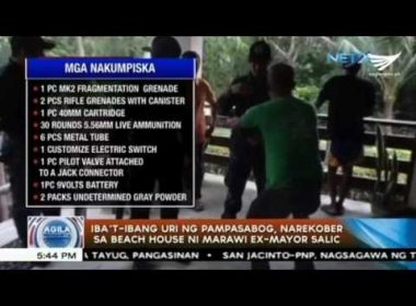 MAGSAYSAY, Misamis Oriental (Eagle News) – Hinalughog ng Magsaysay Municipal Police ang beach house ni ex-Marawi City Mayor Fajad Salic sa Misamis Oriental, at nakumpiska ang iba’t ibang uri ng pampasabog. Nakumpiska mula sa beach house niya sa Purok 5, Brgy. Consuelo, Magsaysay ang: 1 pc mk2 fragmentation grenade 2 pcs rifle grenades with canister 1 pc 40mm cartridge 30 rounds 5.56mm live ammunition 6 pcs metal tube 1 customized electric switch 1 pc pilot valve […]