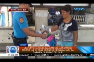 (Eagle News) — Maliban sa laganap na suliranin ngayon ukol sa iligal na droga ay isa din sa tinututukan ngayon ng mga kapulisan paritkular dito sa bayan ng Carmen, Surigao Del Sur ay ang suliranin hinggil sa illegal logging. Dahil dito ay minarapat ng mga kapulisan na ipamahagi sa mga taga-bayan ang mga leaflets na naglalaman ng mga magiging masamang epekto ng illegal logging sa mga indibidwal. Lalo na ngayon at may tinatawag na global […]